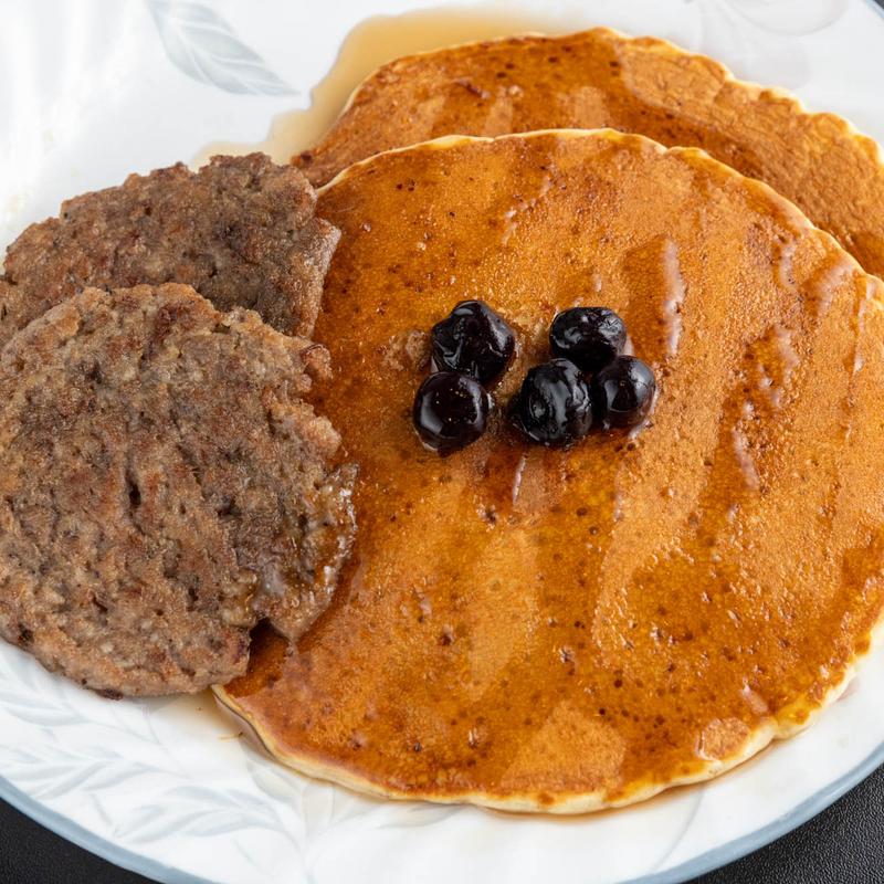 Two buttermilk pancakes and choice of protein | Chocolate chip or blueberry pancake +$1.45
